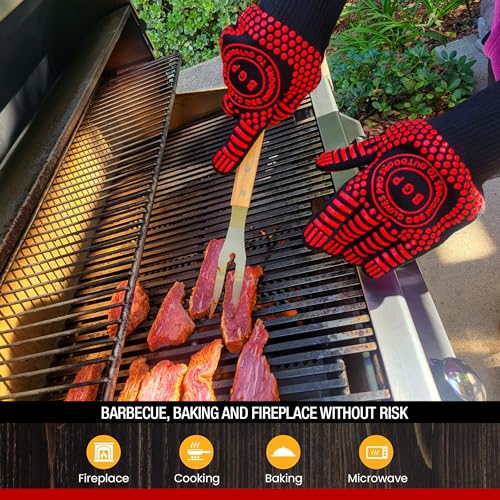 Red BBQ Gloves, 1472°F Heat resistant Gloves, 13.4-Inch Non-Slip Silicone, Moisture-Proof Kitchen Safety Gloves for Cooking, Baking, Grilling, Fireplace, and Outdoor (Red and Black)