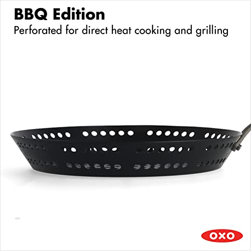 OXO Obsidian Pre-Seasoned Carbon Steel, 12″ Frying Pan Skillet with Holes for Grilling with Removable Silicone Handle Holder, Induction, Oven Safe, Black