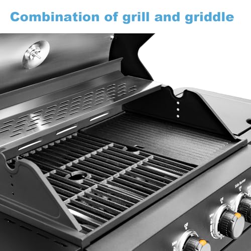 2 in 1 Propane Gas BBQ Grill with Side Burner & Porcelain-Enameled Cast Iron Grate, 4-Burner Flat Top Grill, 46,700 BTU Barbecue Grill, Outdoor Propane Griddle Grill Combo for Camping, Patio, Backyard