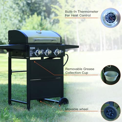 grill propane 3 burner gas grill, Propane grill, bbq grill with thermometer, gas grill outdoor for small gatherings, 30000 BTU barbecue grill with Foldable Rack.