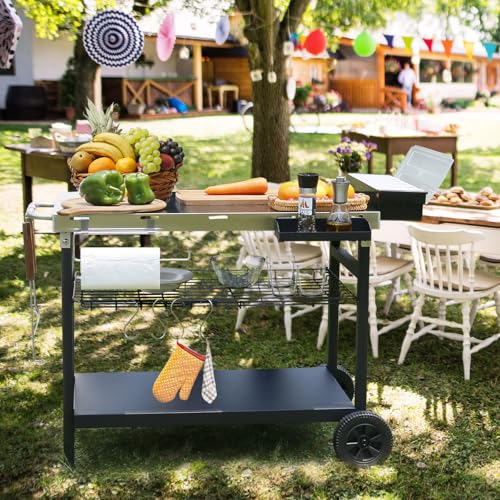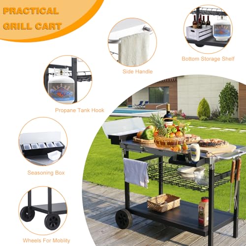 Outdoor Grill Cart,3-Shelf Movable Kitchen Cooking Prep BBQ Cart with Wheels,Outdoor Grill Stand with Seasoning Box,Spice Box,Paper Towel Holder and 4 Hooks, Indoor Outdoor Cooking Station